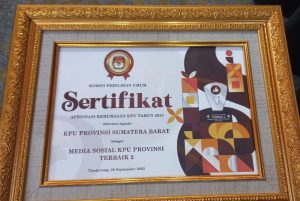 PADANG – Komisi Pemilihan Umum (KPU) Provinsi Sumatera Barat (Sumbar) meraih penghargaan terbaik II dalam kategori pengelolaan media sosial terbaik di tingkat KPU Provinsi se-Indonesia. Penghargaan ini diberikan dalam rapat koordinasi nasional kehumasan dan PPID KPU, di Tanggerang 25 – 27 September 2023.