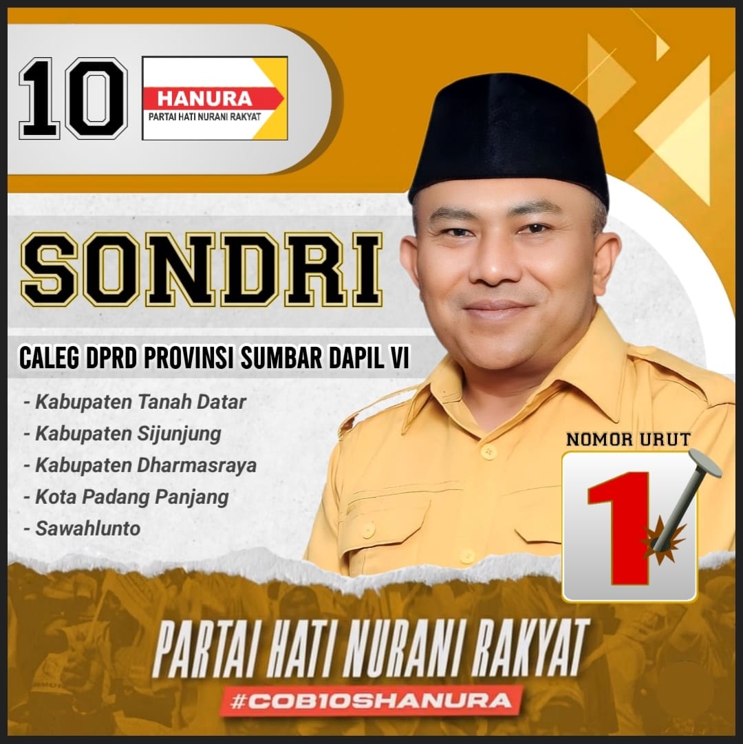 Padang,— Sondri, mantan ketua KPU Tanah Datar periode 2008-2013 kini mencoba peruntungan maju jadi calon anggota DPRD Provinsii Sumbar, Daerah Pemilihan VI yang mencakup Kabupaten Tanah Datar, Kota Padang Panjang, Kabupaten Sijunjung, Kabupaten Dharmasraya serta Kota Sawahlunto. “Dulu jadi “wasit”(penyelenggara) sekarang coba jadi peserta Pemilu” ujar Sondri. “Begitulah kehidupan, selalu berputar dan mengalir,” tambahnya.
