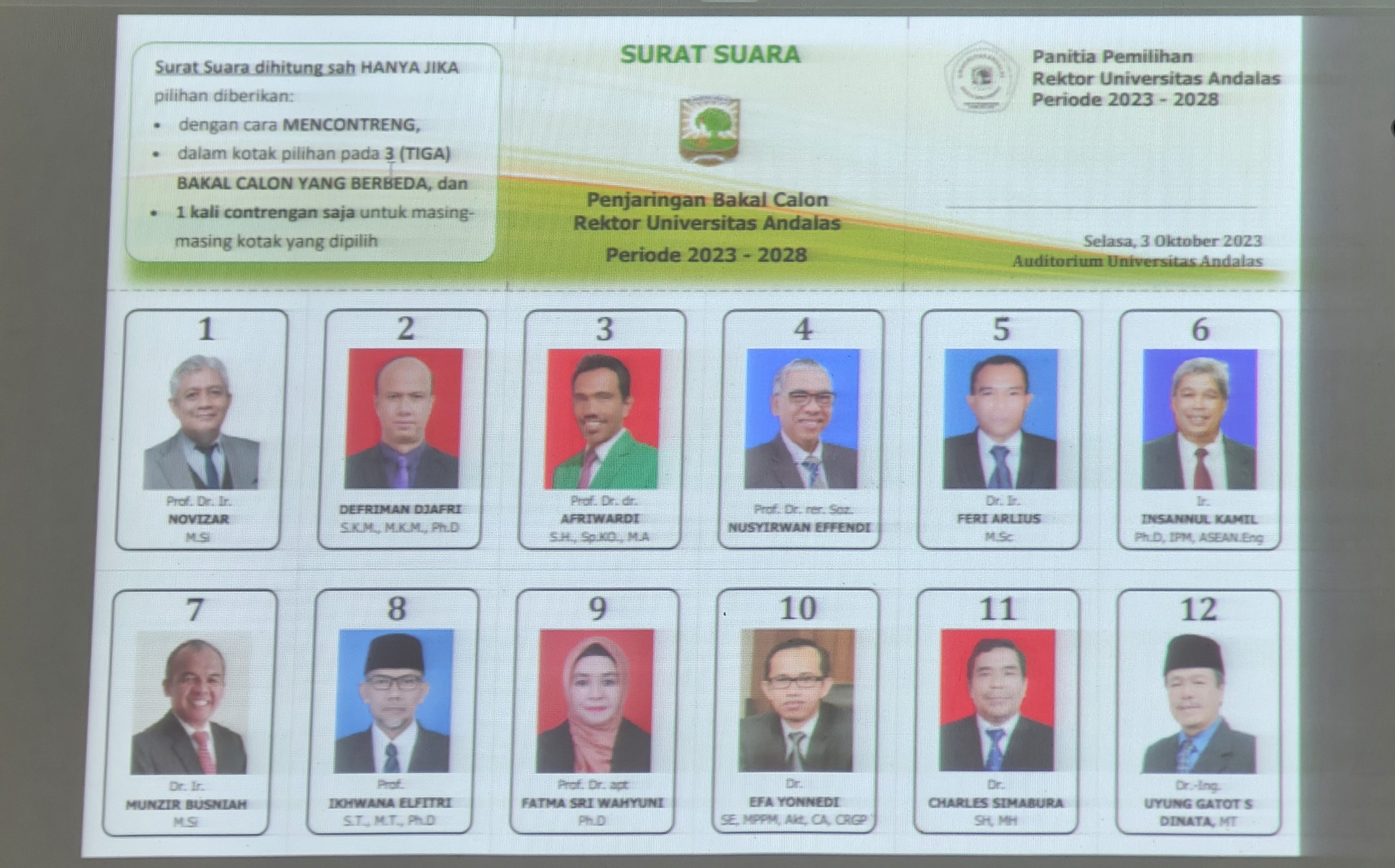 Sedangkan satu-satunya Balon Rektor perempuan yang mendaftar Prof Fatma Sri mendapatkan nomor 8. Lalu Balon atas nama Dr Uyung Gatot, sedangkan nomor 10 Balon yang menjabat Dekan FEB Prof Efa Yonnedi, nomor urut 11 Prof Ikhwan Elfitri dan nomr urut 12 Prof Nursyirwan Effendi.